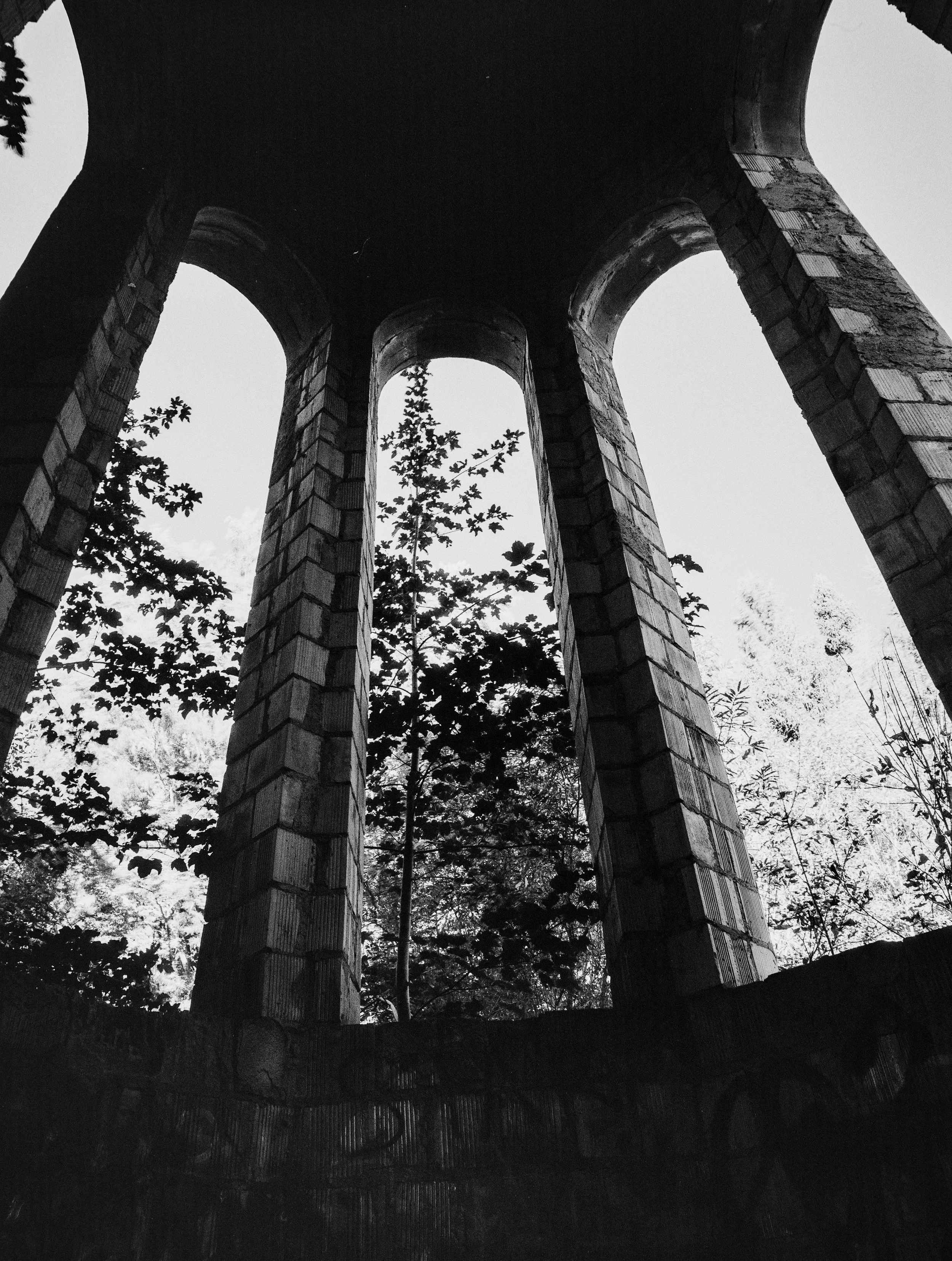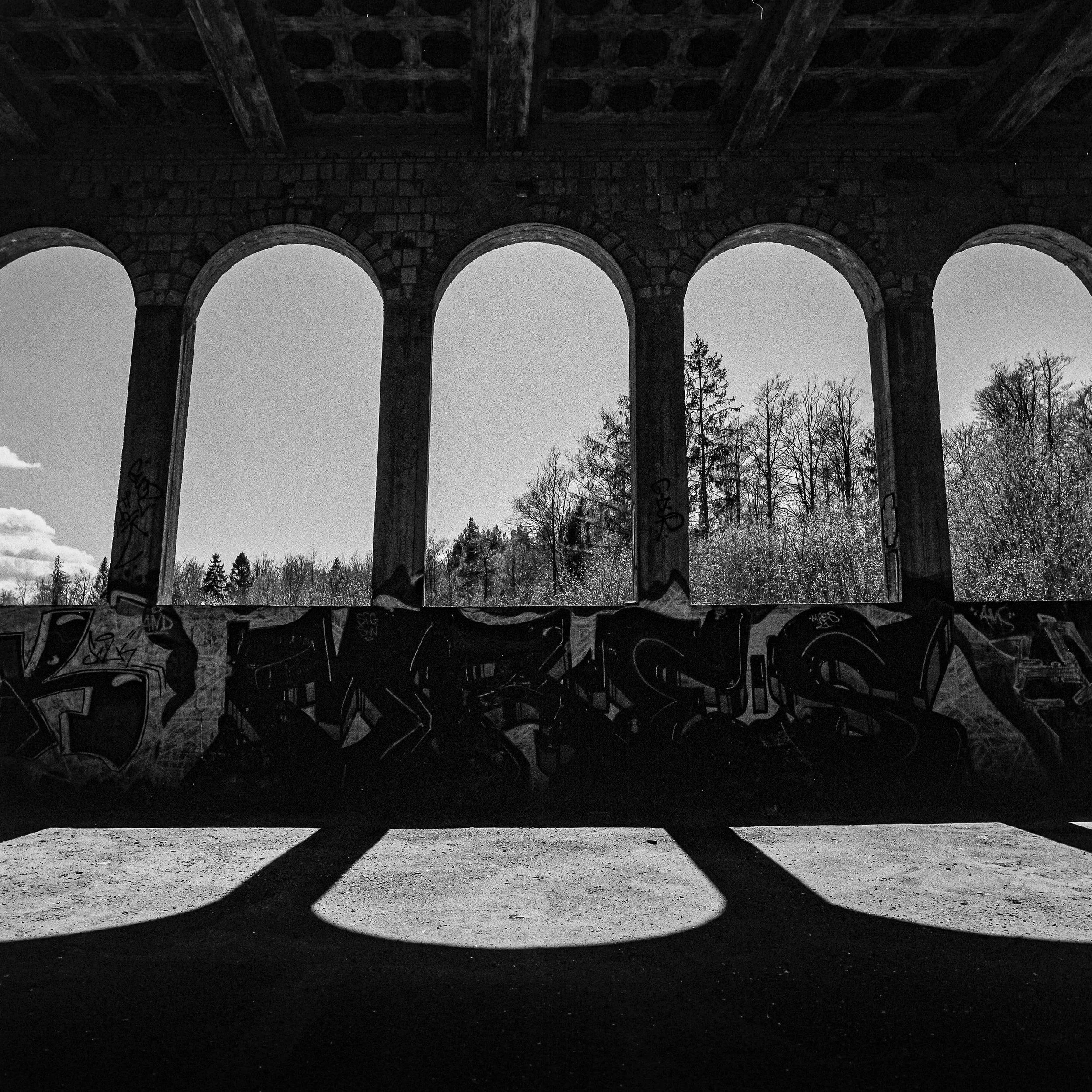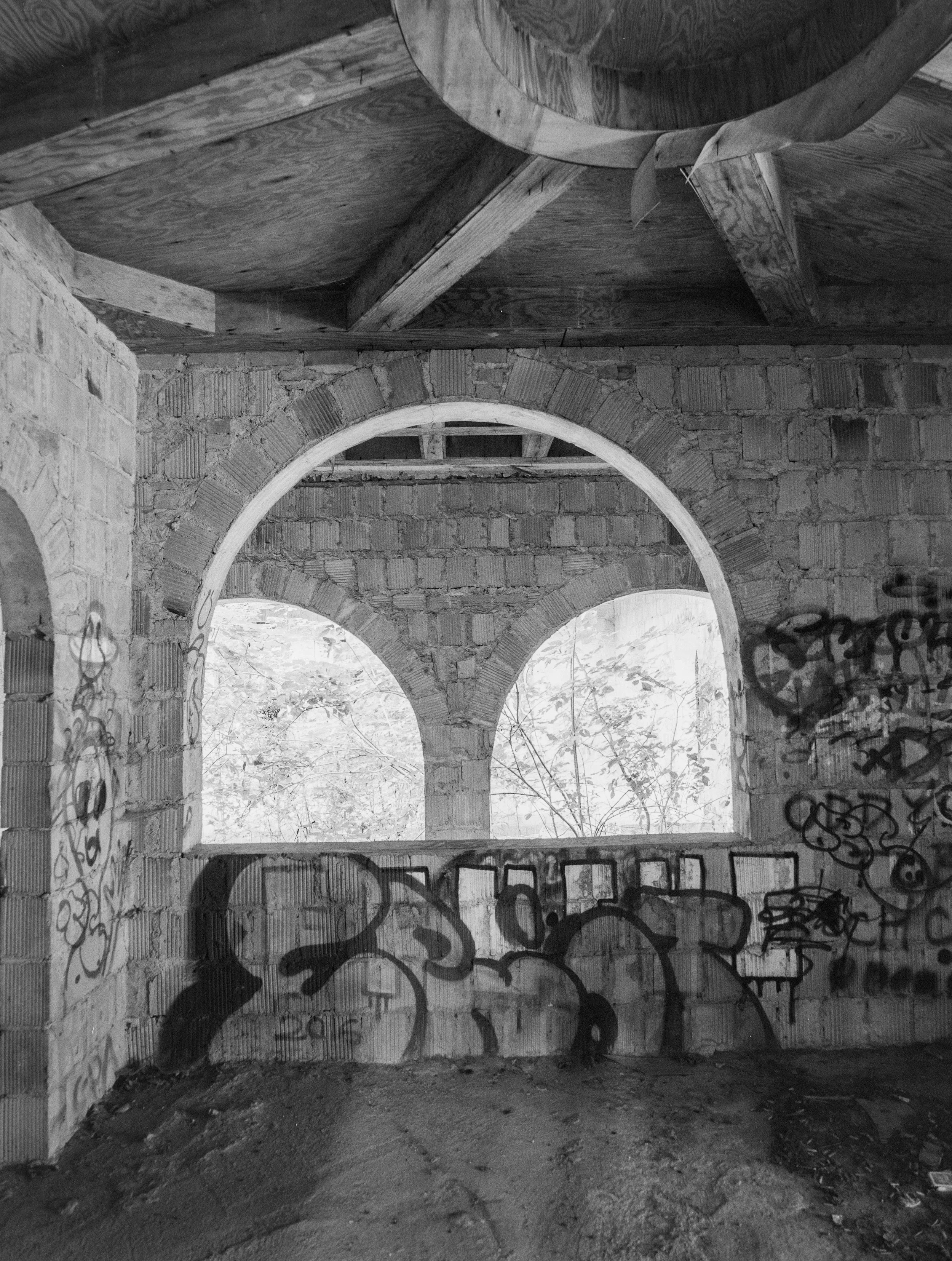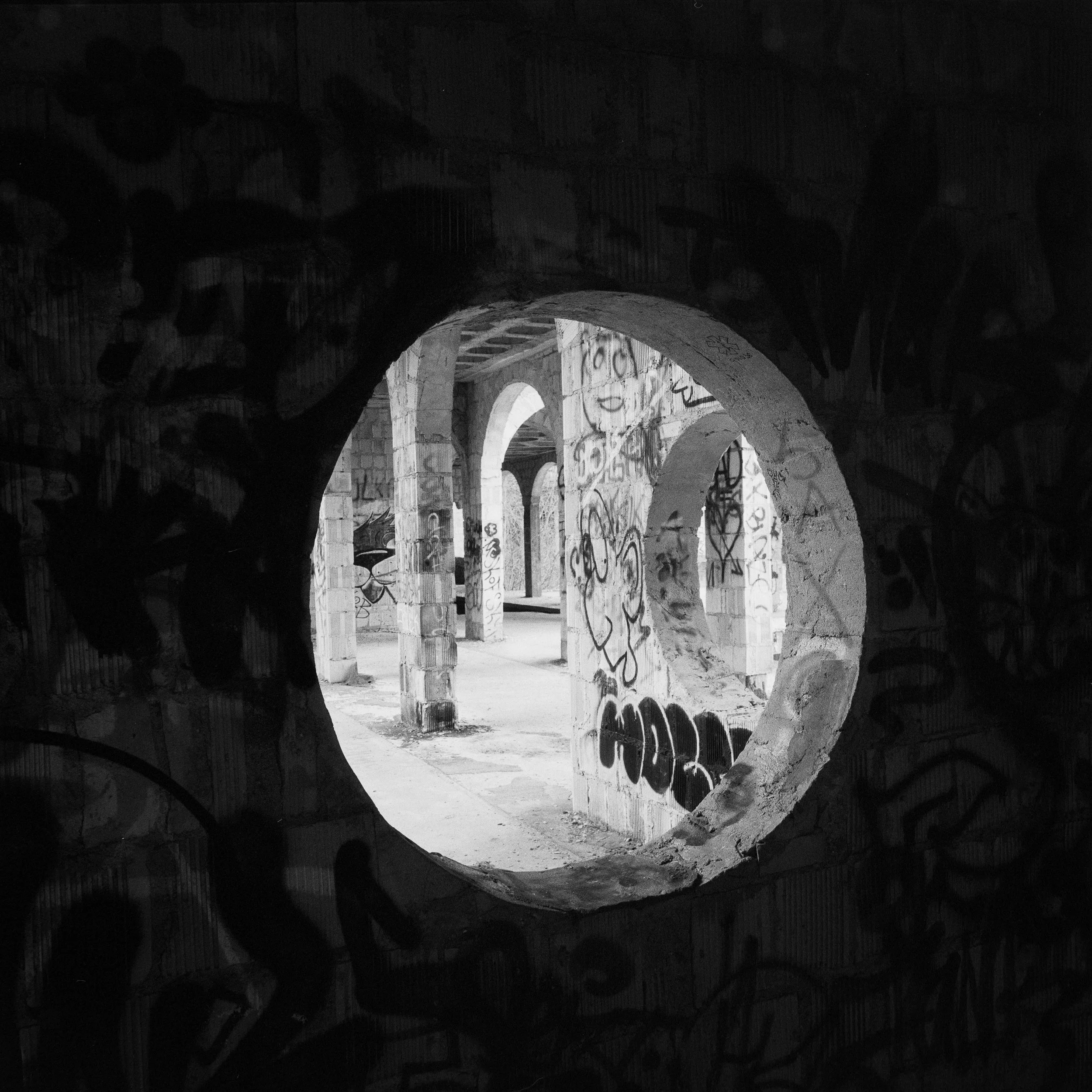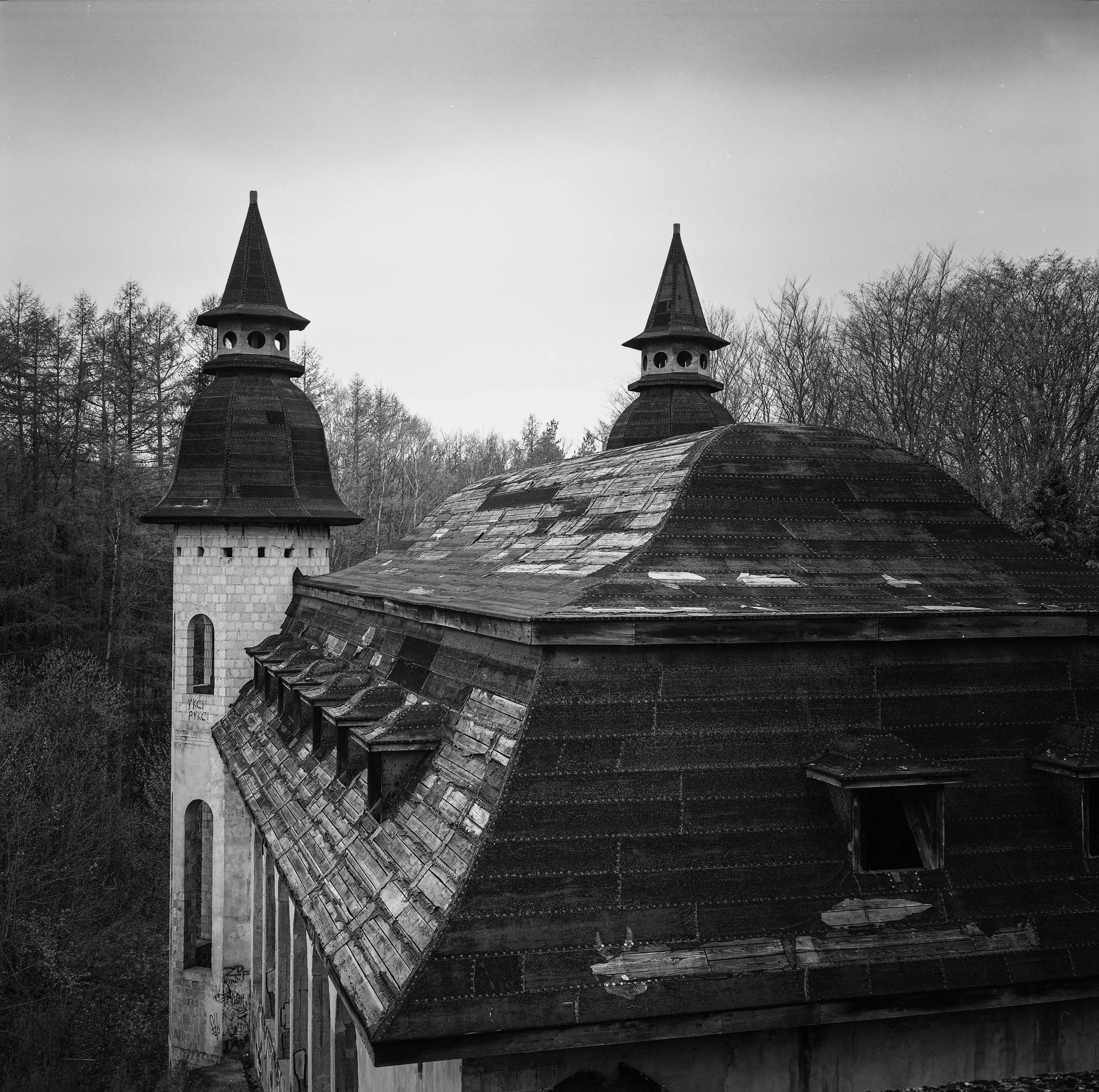 Medium format imposes deliberation. Each frame captures fine detail: textures of unfinished concrete, the rhythm of staircases, the intrusion of light through empty openings.