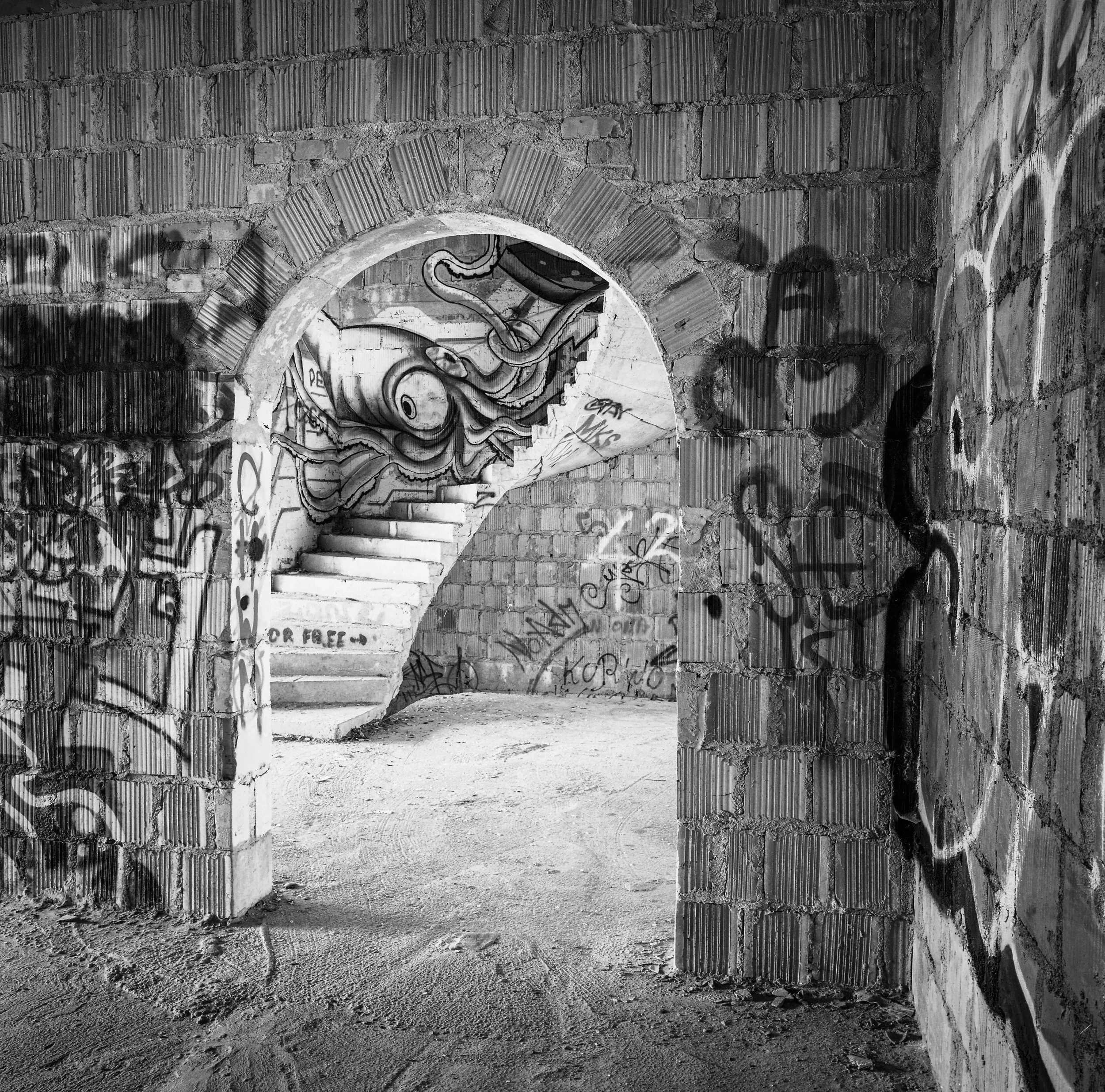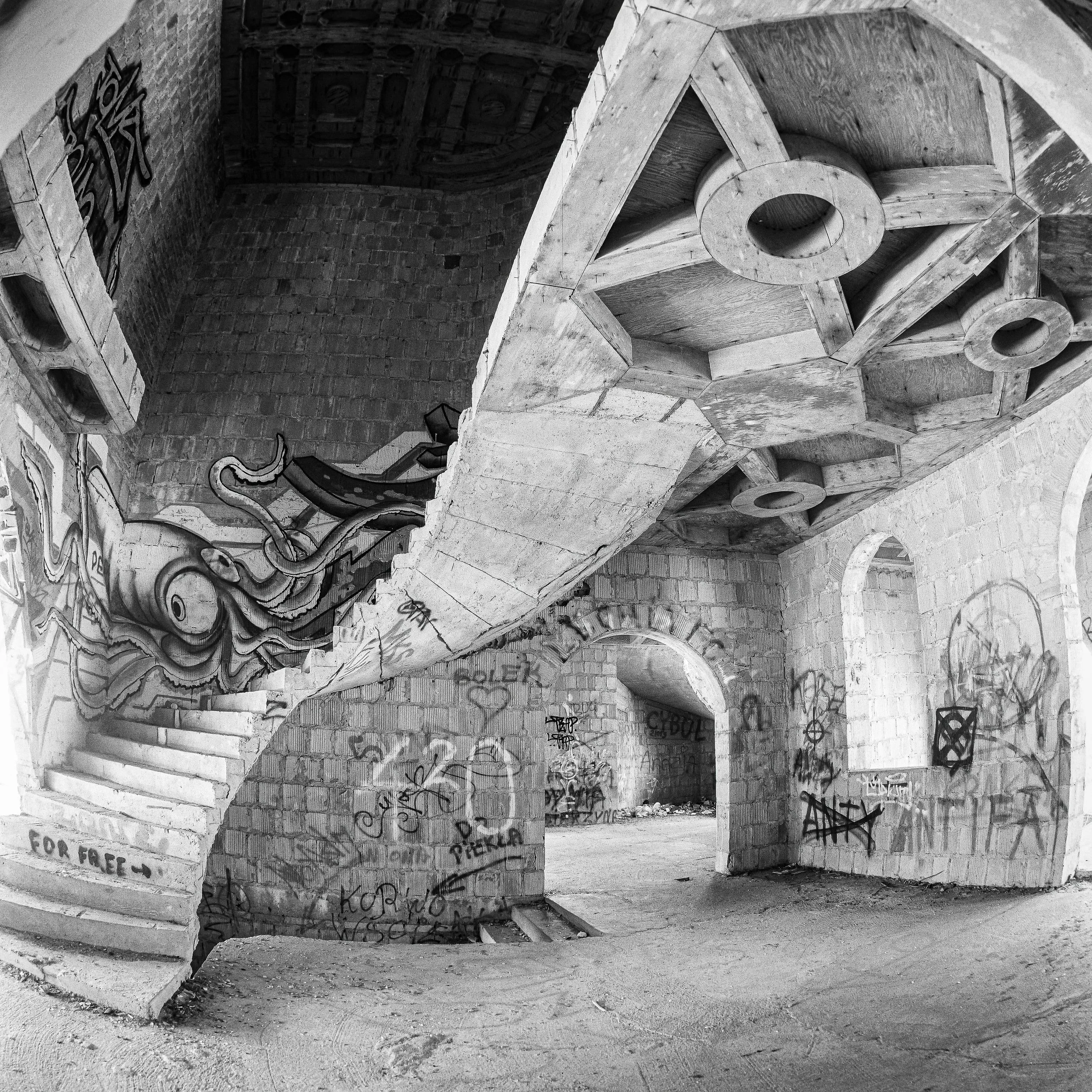 Light enters without mediation. It defines space rather than illuminating it. Corridors dissolve into shadow; staircases emerge as sculptural forms. There is no habitation—only scale, silence, and interruption.
