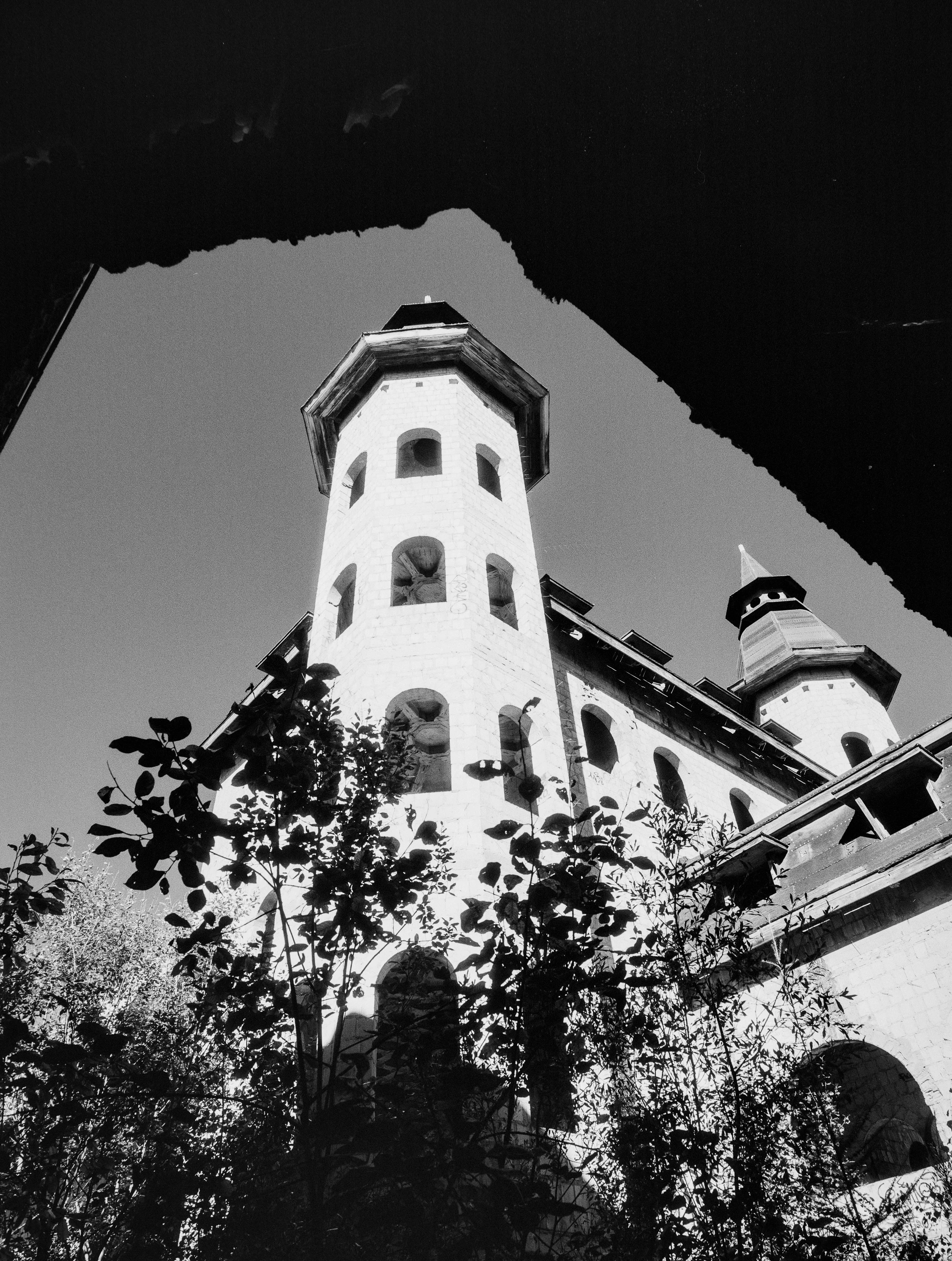 Black and white isolates structure from distraction, reducing the building to mass, geometry, and repetition. In this reduction, the castle is revealed not as architecture in use, but as form without resolution.